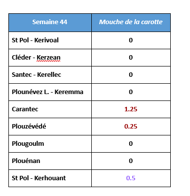 Mouche de la carotte : baisse des captures sur tous les secteurs, seule une parcelle restant au-dessus du seuil de risque. Le 3e vol semble baisser en intensité , à voir les semaines suivantes si cette observation se confirme.