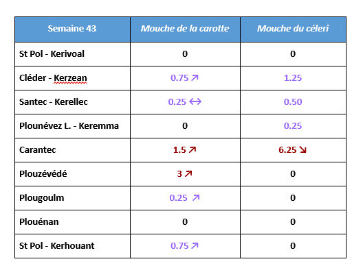 Mouche de la carotte : après une légère accalmie la semaine dernière, les piégeages de mouches repartent à la hausse. Deux parcelles dépassent à nouveau le seuil de risque d’1 mouche par plaque et par semaine. Le 3e vol se poursuit.