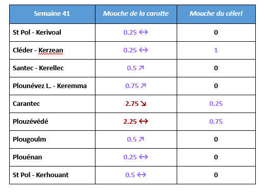 - Mouche du céleri : légère augmentation cette semaine. Attention aux parcelles de céleri branche proche de la récolte.
